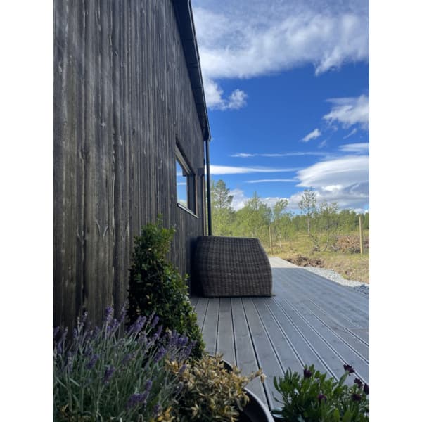 Vår Duo terrasse, har en rillet rettside og en glatt høvlet bakside. Den benyttes i hovedsak til terrassegulv, men kan også brukes til rekkverk trapper o.l. Terrassebord legges med noen mm avstand, slik at vann kan renne ned og opptørking kan skje fra alle sider. Forbruk: ca 6,8lm pr m2 Alvdal Royal behandlet terrasse er vedlikeholds vennlig, relativt formstabil og har lang levetid. Behandlingen er en 2 trinns prosess hvor materialene først impregneres (kl AB) for deretter å kokes i royal olje. Dette gir et UV beskyttet produkt med transparent farge, nyanser skapes avhengig at trestruktur. Vi anbefaler syrefaste festemidler samt at alle snittflater etterbehandles med Alvdal Royal olje.